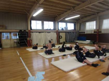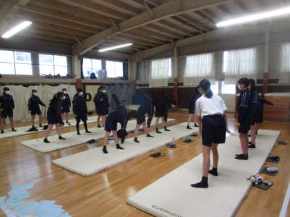 2学期最後の3年生女子の保健体育は、「オリジナルトレーニングメニューを作ろう」という課題で、受験期にやればよいトレーニングや冬休みにやればよいトレーニング、勉強の合間にやればトレーニングをクロムブックで調べてグループで発表し、みんなでトレーニングをしてみました。寒い日となりましたが1人1種目考えたトレーニング(全部で約30種類)をやるとさすがに体も温まったようです。進路に向けて頑張りながら時々体も動かしてほしいという気持ちで授業をしました。