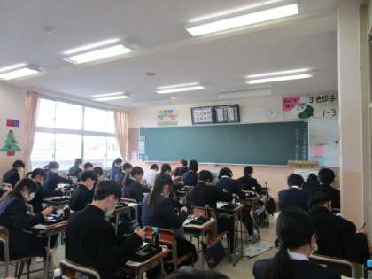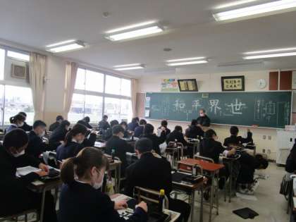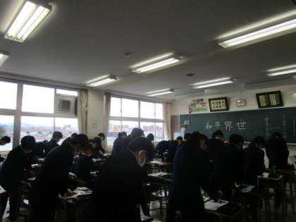 1年 書き初め練習 公開日 2022/12/22 更新日 2022/12/22 1学年 今日の4時間目に、3学期の始業式の日に行う書き初めの練習を行いました。1年生は「世界平和」です。みんな集中して取り組んでいました。大会本番もがんばってください。