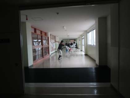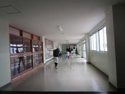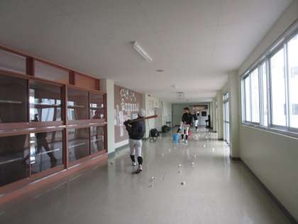 1月5日(木)午前 野球部が給食室前でバドミントンのシャトルを投げてバットで打つ練習をしていました。