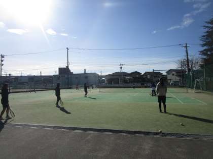女子ソフトテニス部が男子の後、オムニコートで陽ざしを浴びながら練習していました。
