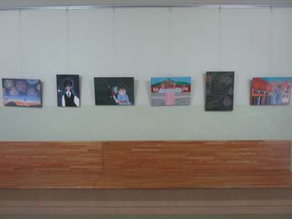 美術部の作品が1階西渡り廊下に展示されています。放課後や冬休み、こつこつと活動して仕上げていました。