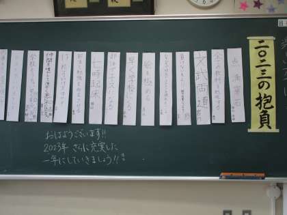 1年4組 2023の抱負 公開日 2023/01/10 更新日 2023/01/10 1学年 1年4組の黒板には、2023年の抱負が短冊で黒板に掲示されていました。よい年になるよう抱負が達成できるよう頑張ってください。