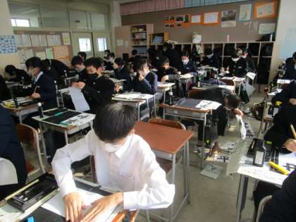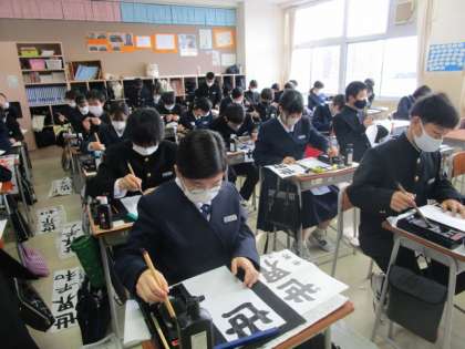 書き初め大会 公開日 2023/01/10 更新日 2023/01/10 1学年 書き初め大会 1年2組 始業式の後、書き初め大会が行われました。今年の字は「世界平和」です。冬休みの練習を生かして、お手本を見ながら真剣に書いていました。