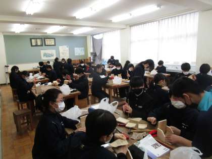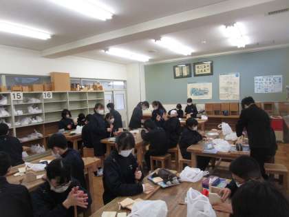 1月16日(月)3限 1年3組の技術はCDラックの制作をしています。それぞれ一生懸命作業に取り組んでいました。