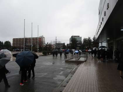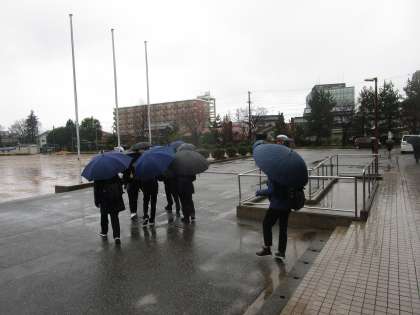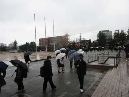 雨の中の下校 公開日 2023/01/16 更新日 2023/01/16 学校だより 1月16日(月)13時15分 午後、先生方の研修会のため、生徒は給食後、下校となりました。色とりどりの傘で一斉の下校となりました。午後、有意義にゆとりの時間を使ってください。