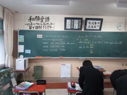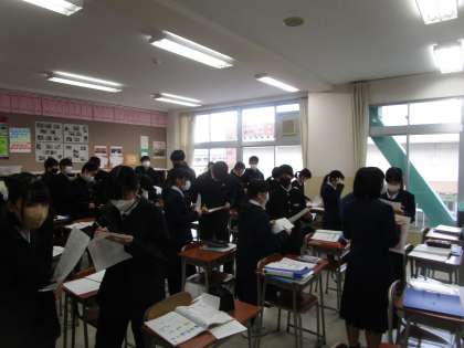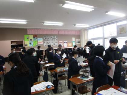 2年6組 英語 公開日 2023/01/18 更新日 2023/01/18 2学年 1月18日(水)4限 2年6組の英語は、「クラスメートにインタビューしよう」という課題で「クラスメートの好きな○○は?」をお互い質問しながらメモしていました。男女仲よく聴き合っていました。とてもいい雰囲気で学習していました。
