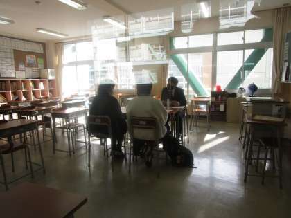 3年1月進路懇談会2日目 公開日 2023/01/19 更新日 2023/01/19 3学年 1月19日(木)午後 3年生の1月の進路懇談会2日目です。寒い中、ご来校ありがとうございます。廊下で親子で相談している姿も見られました。学校での話し合い、ご家庭での話し合いをされてよりよい進路選択をしてほしいと願っています。 毎日の学習も積み重ね、入試に向かってください。