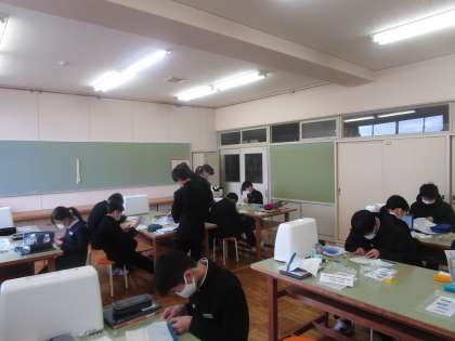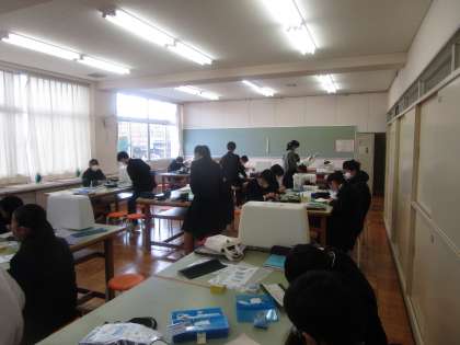 2年5組 家庭 公開日 2023/01/20 更新日 2023/01/20 2学年 1月20日(金)4限 2年5組の家庭科は被服室で「まつり縫い」の実習をしていました。みんな一生懸命縫っていました。先生に確認してもらい上手にできているかチェックしてもらっていました。「男子の○○君とても上手です」と紹介してもらいました。褒められた生徒は満面の笑みを浮かべてうれしそうでした。