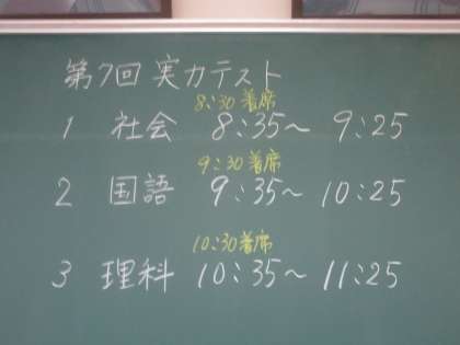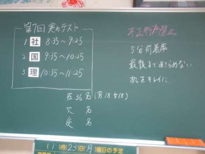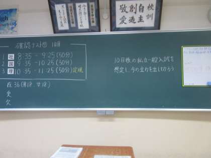 3年生の教室の黒板には本日の確認テストの日程等が書いてありました。