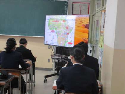 1組 社会科 公開日 2023/01/23 更新日 2023/01/23 1学年 1限は社会科でした。アフリカ州の地形や気候について、地図を見ながら考えました。生徒はアフリカ州の地図を興味深そうに見ていました。アフリカ州に関心をもつ人が増えそうです。