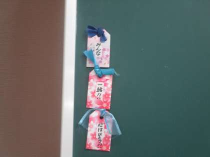 3年6組の黒板のすみに6月の運動部の大会に向けて3年生で作ったお守りが飾ってありました。受験でも「みんな 一緒 心はひとつ」で頑張ってください。