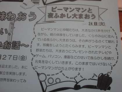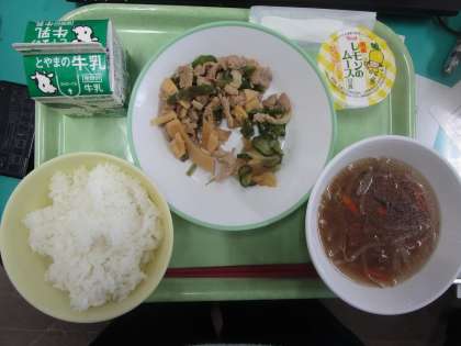 学校給食週間2日目 ピーマンマンと夜更かし大まおう 公開日 2023/01/25 更新日 2023/01/25 学校だより 1月24日(火) 給食週間2日目、ごはん、牛乳、ピーマンマンの炒め物、かぶの中華和え、春雨スープ、レモンムースでした。