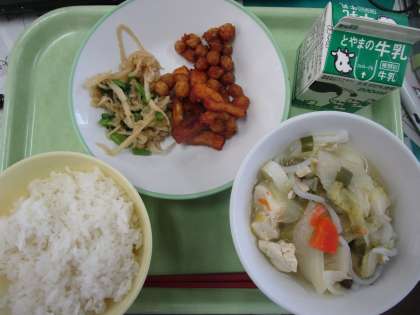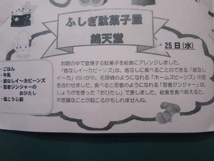 本日の給食は、ごはん、牛乳、底なしイーカビーンズ、忍者ジンジャーのおひたし、塩こうじ鍋でした。