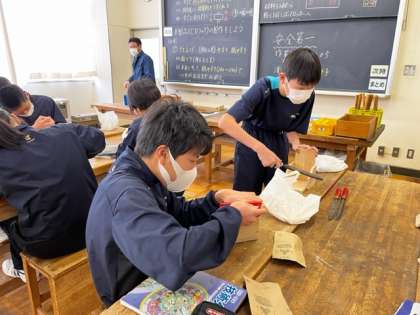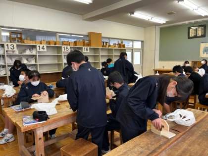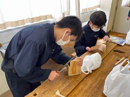 1年4組 技術 公開日 2023/01/26 更新日 2023/01/26 1学年 2限の技術では「木製品(CDラック)の製作をしよう。」という課題で学習していました。 先生からのアドバイスをもらいながら、様々な道具を用いて、仕上げの作業をしていました。
