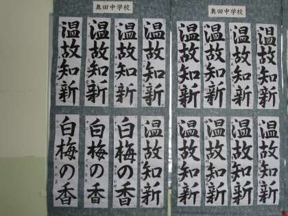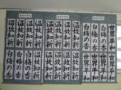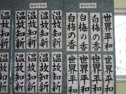 富山市中学校書写展覧会出品作品展示 公開日 2023/01/26 更新日 2023/01/26 学校だより 1月21日(土)、22日(日)に行われた富山市中学校書写展覧会出品作品を校長室横の渡り廊下に展示しました。力作揃いです。ぜひ、鑑賞してみましょう。