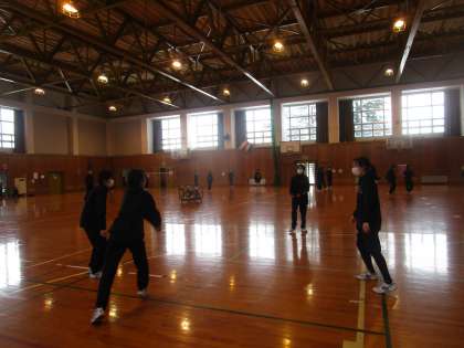 男女混合グループで協力して扇形パスの練習をしていました。