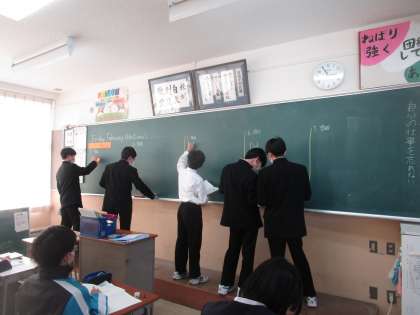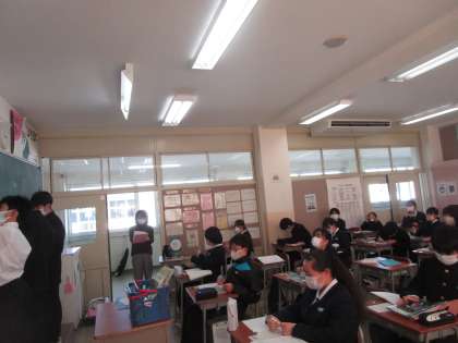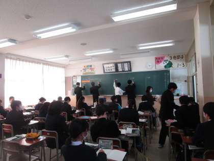 2月17日(金)6限 1年3組の英語は、新しい文型を学習していました。黒板の前に出て文型を書いていました。