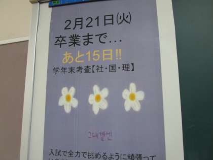 卒業まであと15日 公開日 2023/02/21 更新日 2023/02/21 3学年 2月21日(火) 卒業まで登校するのもあと15日となりました。奥田中学校での1日1日をかみしめながら目標に向けて頑張っています。