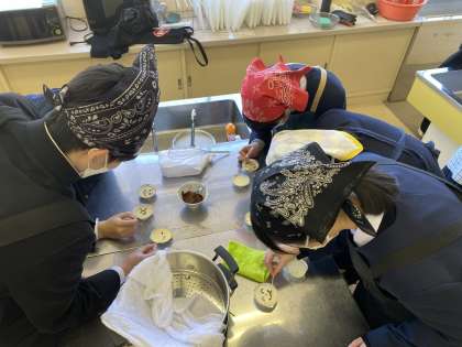 2限までの学年末考査を終え、3限から通常授業になりました。5組は家庭科で、幼児のためのお絵描き蒸しパンを作りました。