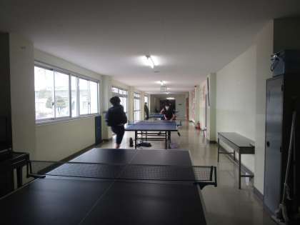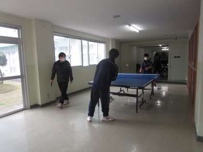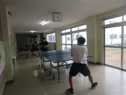 給食室前廊下で男子卓球部が練習していました。久しぶりの大好きな卓球に思いきりプレーしていました。