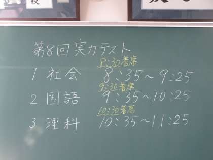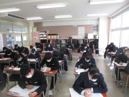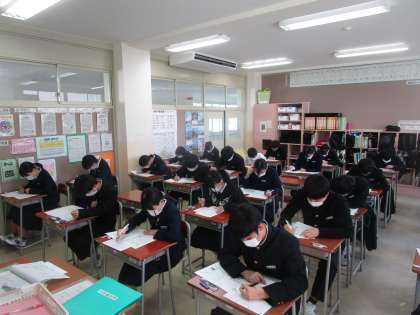 3年生第8回確認テスト 公開日 2023/02/27 更新日 2023/02/27 3学年 2月27日(月)1限 中学校生活最後の校内での第8回確認テストです。来週の県立一般入試に向けての最終確認です。内定している生徒も中学校生活の学習の総確認となります。自己ベストを目指して、今日、明日頑張りましょう。
