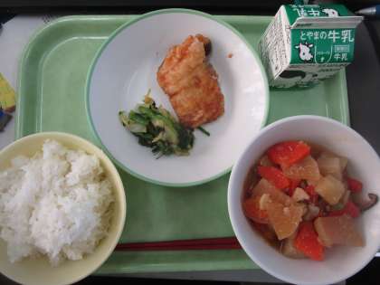 2月28日(火) 2月最後の給食は、ごはん、大和煮、揚げ魚のレモン味、昆布和え、牛乳でした。