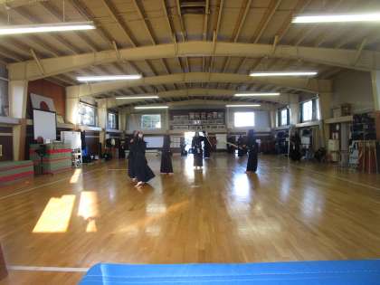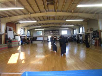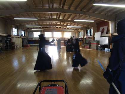 剣道部が実践形式で練習していました。審判をつけてレベルアップを図っていました。