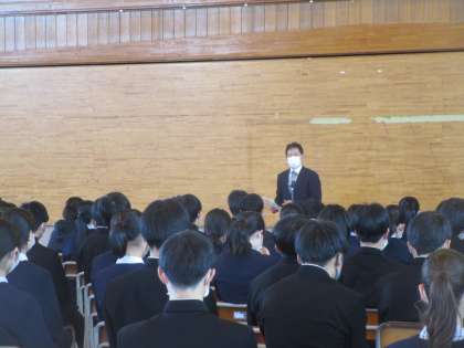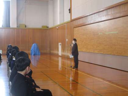 県立一般入試激励会 公開日 2023/03/07 更新日 2023/03/07 3学年 3月7日(火)5限 体育館にていよいよ明日、明後日に行われる県立一般入試の激励会が行われました。 校長先生から、今日、明日いつものように生活し、体調を整えて受験すること、今までやってきた自分を信じて平常心で力を出し切るようお話がありました。中学校生活3年間、1年間頑張ってきた皆さんなら必ず道が開けると力強い言葉をいただきました。 進路指導主事の先生より受験に向けての諸注意、最終確認がありました。
