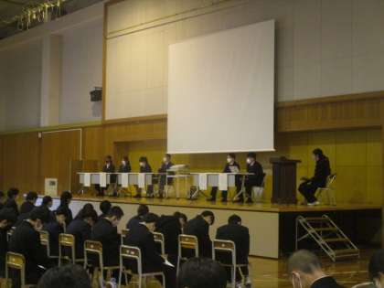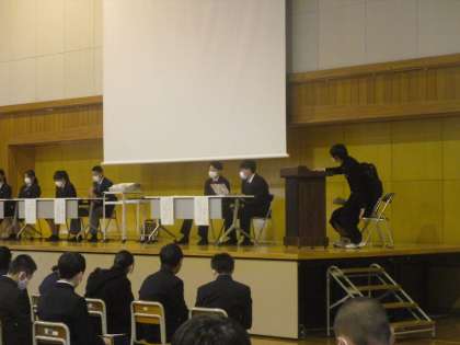 2年生 進路に学ぶ進路学習 その2 公開日 2023/03/08 更新日 2023/03/08 2学年 卒業生6人とパネルディスカッション形式で前もって生徒が考えた質問や聞きたいことに6人に答えてもらい、各高校等の特徴や高校等へ行って何が大切なのか、どんな生活を送るのか具体的な情報やアドバイスをもらいました。