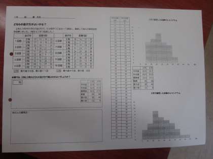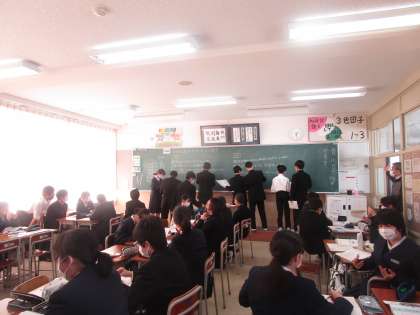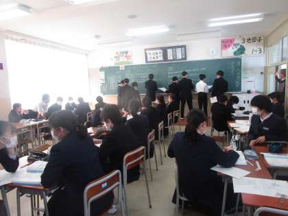 3月8日(水)5限 1年3組の数学は、2列、3列どちらの並び方がいいか理由を黒板に書いていました。