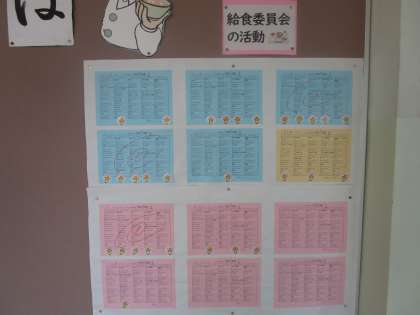 給食室前の掲示板に残食0運動の各クラスの結果が掲示されました。