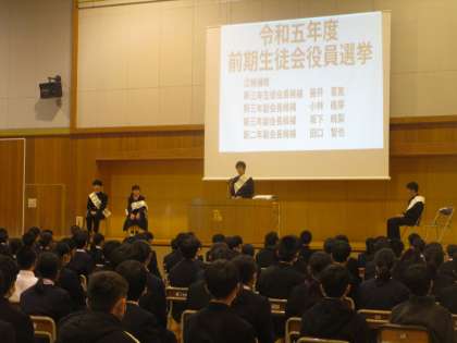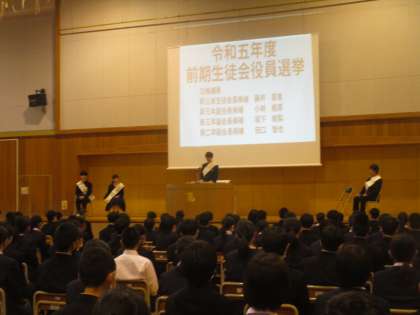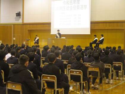 生徒会役員選挙立ち会い演説の様子 公開日 2023/03/09 更新日 2023/03/09 生徒会 会長候補1名、副会長候補3名の立ち会い演説がありました。令和5年度前期の生徒会を、奥田中学校をこんなふうにしたいという主張を1・2年生の生徒の前で堂々と述べてくれました。