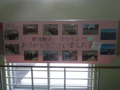 3年生の皆さん、部活動あいさつリレーありがとうございました 公開日 2023/03/10 更新日 2023/03/10 生徒会 1階と2階の間の階段踊り場の掲示板に部活動あいさつリレーの写真が掲載されていました。3年生の皆さん、さわやかなあいさつありがとうございました。