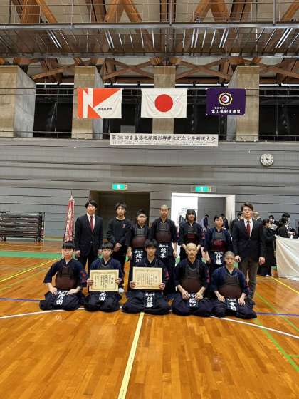 斎藤弥九郎顕彰碑建立記念大会 男子団体優勝! 公開日 2023/03/12 更新日 2023/03/12 部活動 氷見市で行われた斎藤弥九郎大会において、男子団体戦の場で優勝しました。先鋒から大将、その他の部員が心を一つにして優勝を勝ち取りました!