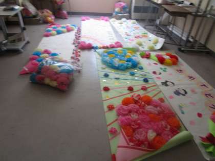 2年生も3年生の教室の飾り付けの準備を進めています。心をこめて作っています。