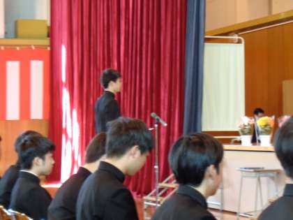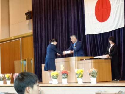 同窓会入会式を行いました。記念品の卒業証書ホルダーを受け取り、歓迎の言葉をいただきました。