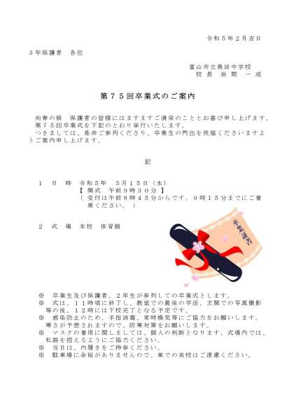 明日は、第75回卒業式です。卒業式の案内を掲載します。