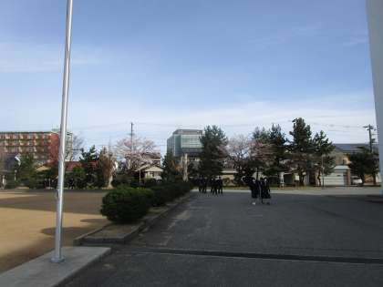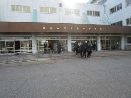 今日も暖かい朝で天候もよい日となりそうです。玄関では校長先生や保健の先生、学年担当の先生が生徒に挨拶し、向かい入れています。