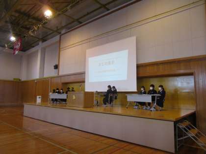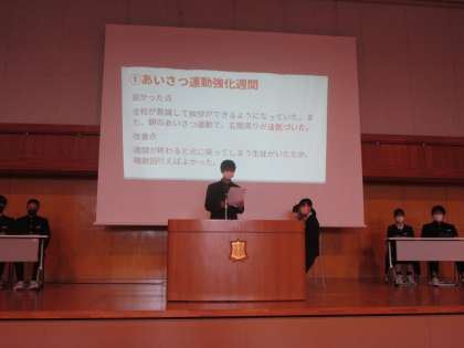 後期生徒会まとめ集会の様子 公開日 2023/03/23 更新日 2023/03/23 生徒会 3月23日(木)5限 後期生徒会のまとめの集会を行いました。後期の活動を振り返り、成果と課題を全校生徒に発表していました。後期生徒会役員、委員長、各委員会の生徒の皆さんありがとうございました。