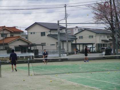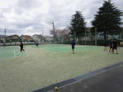 3月23日(木) 少し小雨の中ですが、オムニコートで男子が練習に励んでいました。