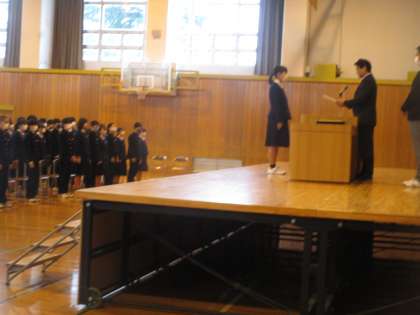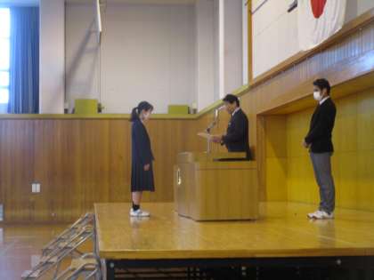 校長先生から1・2年生の代表生徒に修了証を渡しました。