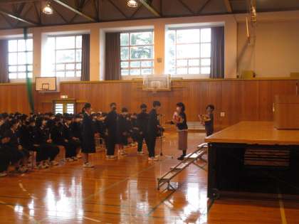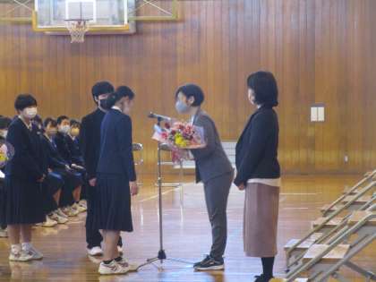 離任式 公開日 2023/03/24 更新日 2023/03/24 学校だより 3月で離任される2人の先生の離任式を行いました。これまでお世話になった感謝の気持ちを言葉と花束で表しました。2人とも2年間奥田中学校の生徒のためにご尽力いただきました。ありがとうございました。