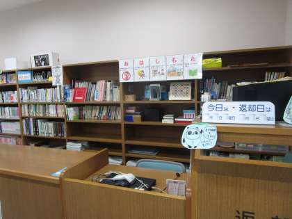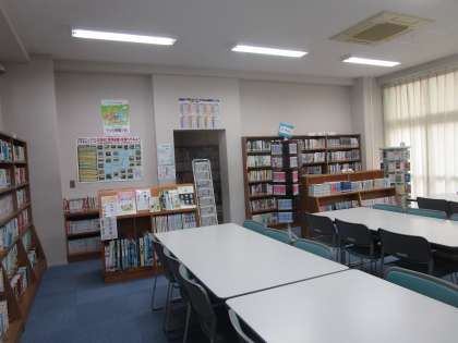 B棟1階の図書室です。少し狭いですが毎月、新刊の本が入ったりして貸し出ししています。ぜひ利用してみてください。