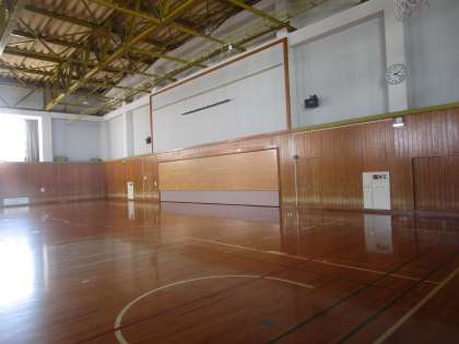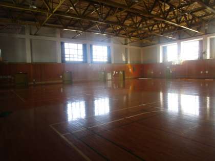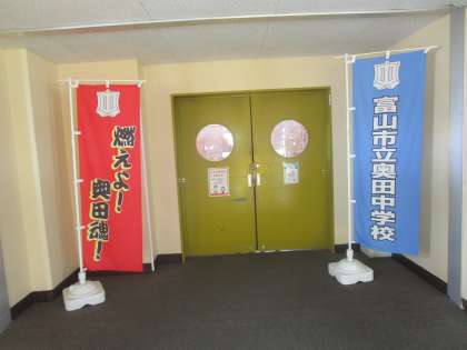 体育館の入り口には燃えろ奥中魂、富山市立奥田中学校ののぼり旗が両サイドにあります。