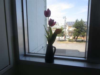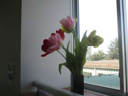 会議室前廊下や校長室前の廊下にチューリップが飾られています。校舎も学校も生徒も潤いあふれる学校にしていきます。