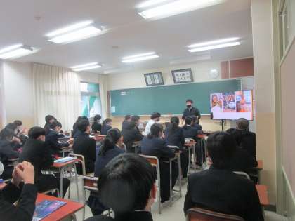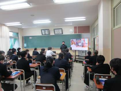 3年6組 英語 公開日 2023/04/12 更新日 2023/04/12 3学年 4月12日(水)4限 3年6組の英語の授業です。先生が写真を見せて、英語で自己紹介していました。3年生初めての授業、英語での自己紹介の学習をしていました。
