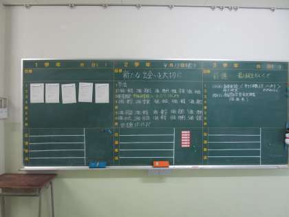1年生はテストも終わり、校舎巡りや自己紹介プリントを書いていました。写真は図書室の説明、職員室の説明、学年黒板の様子です。
