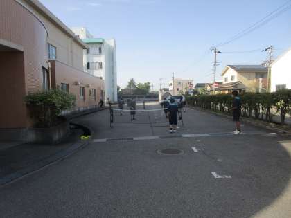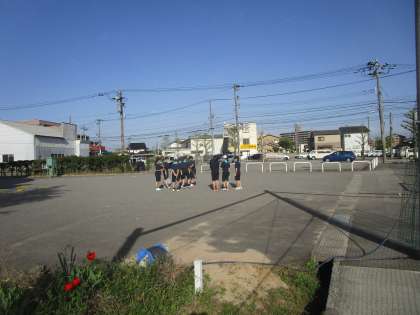 女子は素振りを、男子は簡易ネットで軽くソフトテニスボールの感触を楽しそうに味わっていました。
