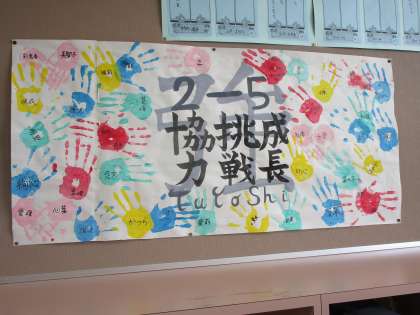 2年5組の教室の後ろの掲示板にクラスみんなの手形入りの学級目標が掲示されていました。