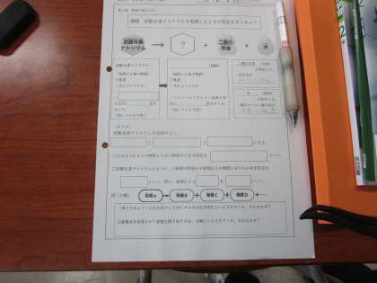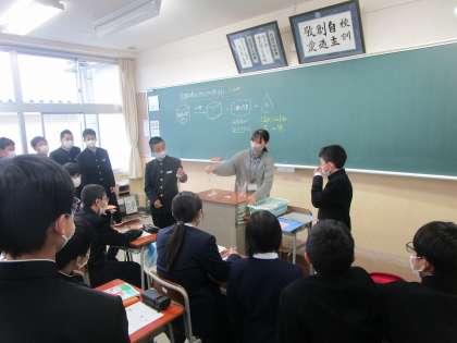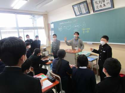2年4組 理科 公開日 2023/04/21 更新日 2023/04/21 2学年 4月21日(金)1限 2年4組の理科は、「炭酸水素ナトリウムをかねつしたときの変化をまとめよう」という課題で学習していました。男子生徒2人が代表して試験管を振って変化を確かめていました。
